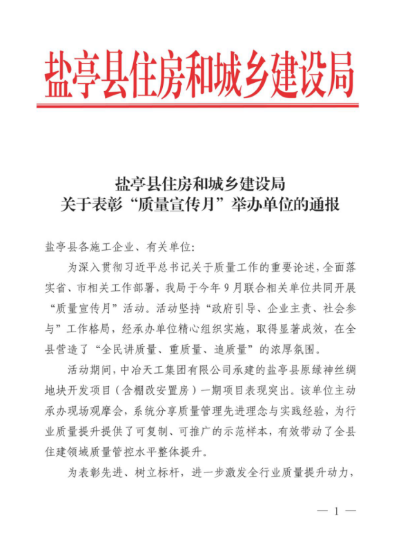 此次榮獲表彰,是鹽亭縣住建局對項目部質量管理工作的高度認可,更是對全體建設者匠心筑造的充分肯定。作為民生工程的建設者,項目團隊承載著群眾對美好生活的向往,項目部始終將“質量是工程的生命線”貫穿建設全過程,以高標準、嚴要求推進各項施工任務,致力于打造讓政府放心、讓百姓滿意的精品工程。